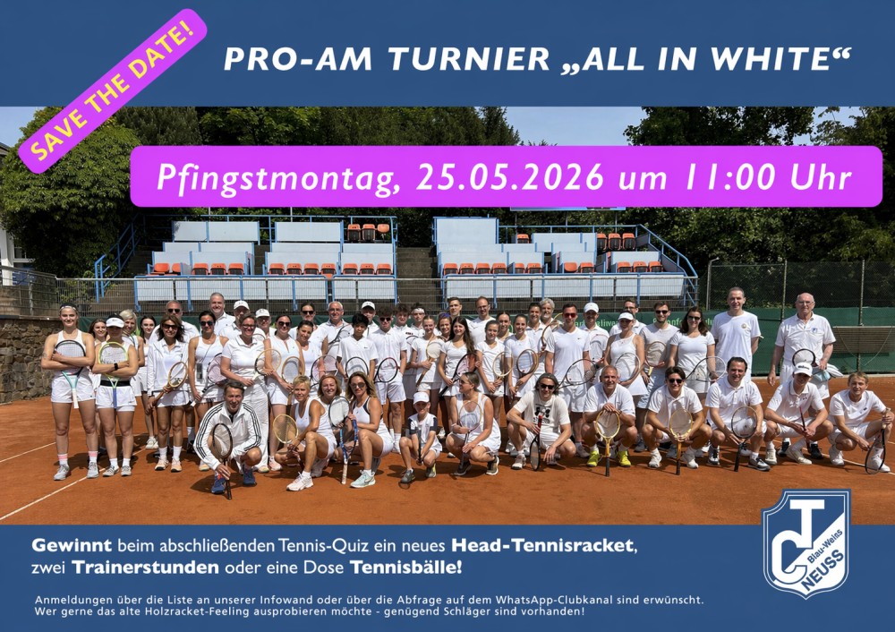Pfingstmontag rückt näher und damit auch unser traditionelles ProAm Turnier „All in White“ mit Turnierdirektor Lutz Steinhöfel. Neben der Freude am Spiel wollen wir zum Abschluss euer Tennis-Wissen testen. Es winken für die Turnierteilnehmer beim Tennis-Quiz tolle Preise: Ein Head Tennis-Racket, zwei Trainerstunden und eine Dose Bälle warten auf die Gewinner.